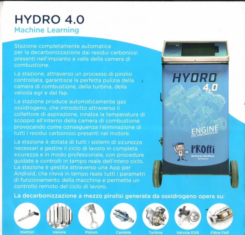 Hydro 4.0 è un sistema italiano avanzato per la decarbonizzazione dei motori endotermici. Utilizza una combinazione di ossidrogeno e agenti chimici per rimuovere i depositi carboniosi da componenti critici come iniettori, valvole, pistoni, turbina, valvola EGR e filtro FAP, ripristinando prestazioni, potenza e riducendo consumi ed emissioni.